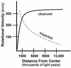 لقد قام العلماء برسم منحنيات بيانية توضح علاقة سرعة المجرات البعيدة بالمسافة التي تفصلنا عنها، ووجدوا أن المنطق الرياضي يفرض أن المجرة كلما ابتعدت عن المركز يجب أن تنخفض سرعة دورانها، تماماً مثل المجموعة الشمسية حيث نلاحظ أن الكواكب القريبة من الشمس تدور بسرعة أكبر من الكواكب البعيدة بسبب بعدها الكبير.