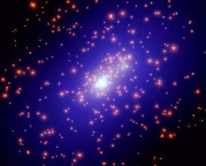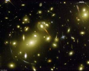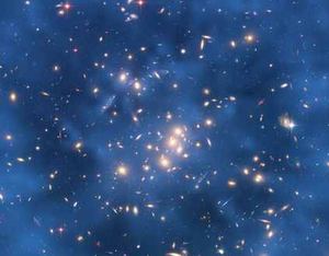 نرى في هذه الصورة عنقوداً من المجرات يبعد عنا بحدود أربعة آلاف وخمس مئة مليون سنة ضوئية، وتكشف التحاليل الدقيقة لهذه الصورة الملتقطة بواسطة مرصد هابل الفضائي أن المادة المظلمة تغلف المجرات وقد لُوّنت بحيث تشكل هالة زرقاء تظهر واضحة في الصورة. المصدر www.nasa.gov
