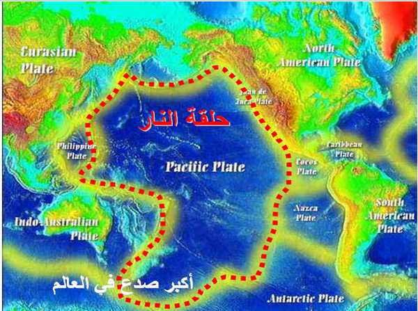 ولكن الذي يثير العجب أنهم اكتشفوا صدعاً ضخماً، فقد اكتشف العلماء صدعاً يمتد لأكثر من 40 ألف كيلو متر، وأسموه حلقة النار Pacific Ring of Fire ، هذه الحلقة موجودة في قاع المحيط الهادئ وتمتد على طول الساحل الغربي لأمريكا مروراً بآلاسكا ثم اليابان والفيلبين وأندونيسيا ثم جزر المحيط الهادئ الجنوبية الغربية ثم نيوزيلندا.